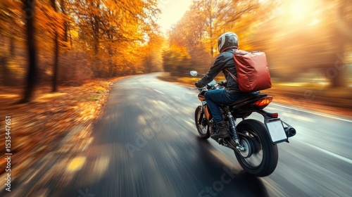 © redflower, Fototapeta premium Motorcyclist in Autumn Forest Road, Express Delivery Concept