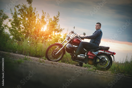 © Dmitriy, Fototapeta premium Motorcyclist is sitting on the motorbike outdoors at sunset.