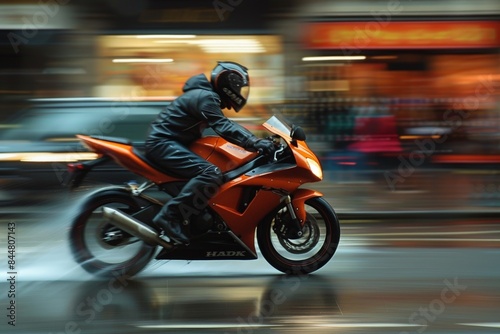 Fototapeta premium Motorcyclist on Orange Sport Bike in Urban Rain