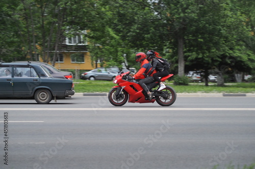 © Ольга Кожина, Fototapeta premium Motorcyclists in special clothes and protective helmets on the goal ride on the city highway. on a red motorcycle. High