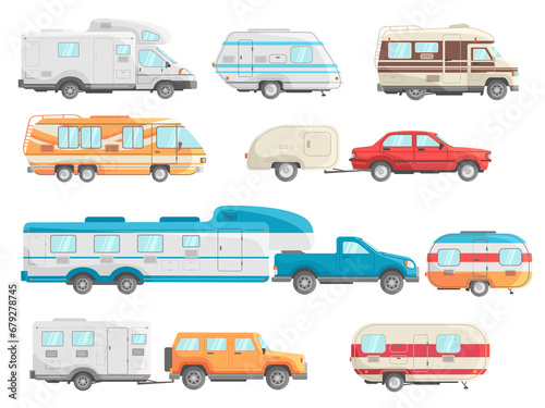 Naklejka premium Motorhome cars. Caravan rv campers, retro travel car, vintage trailer...