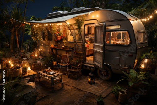 Obraz premium Motorhome in a vegetable garden with coconut trees, grills and fairy lights.