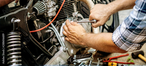 © ghazii, Obraz premium Motorrad Reparatur / Kupplungsdeckel festziehen