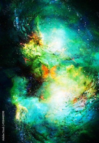 Fototapeta premium motyl i litle taniec ellf na zielonym tle kosmicznego.