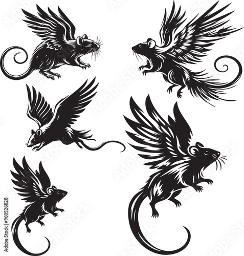 © Awais, Fototapeta premium moue with wings silhouette vector outlines, Rates with wings, Flying rat, Flying Mouse
