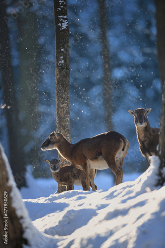 Naklejka premium Mouflon ewe and her cub in winter snowing forest