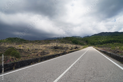 Naklejka premium Mount Etna access road with dramatic view of Etna Mountain during dangerous...