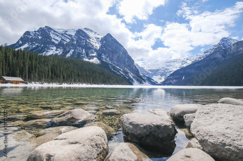 Fototapeta premium Mount fairview, partly frozen lake, rocks in foreground. Lake Louise Banff National Park, Alberta Canada