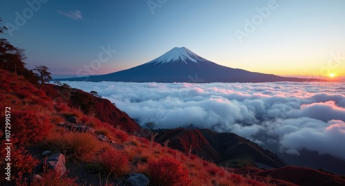 © Collse, Fototapeta premium Mount Fuji, Japan, symmetrical snow-capped peak rising above forested landscapes, capturing the iconic beauty and cultural significance of Japan’s tallest mountain.