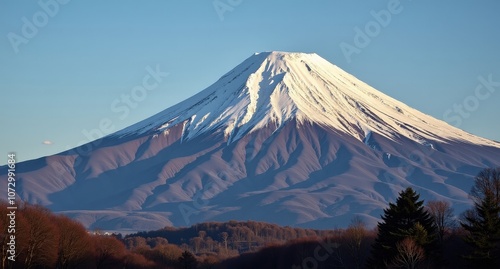 Fototapeta premium Mount Fuji, Japan, symmetrical snow-capped peak rising above forested landscapes, capturing the iconic beauty and cultural significance of Japan’s tallest mountain.