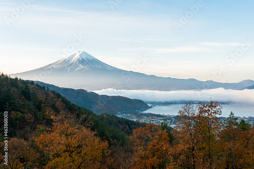 © Smiley Dog, Fototapeta premium Mount Fuji, Lake Kawaguchi, and red maple trees during the autumn foliage season in Kawaguchiko, Japan.