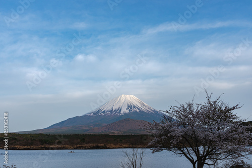 Obraz premium Mount Fuji or Mt. Fuji, the World Heritage, view in Lake Shoji ( Shojiko ). Fuji Five Lake region, Minamitsuru District, Yamanashi prefecture, Japan. Landscape for travel destination.