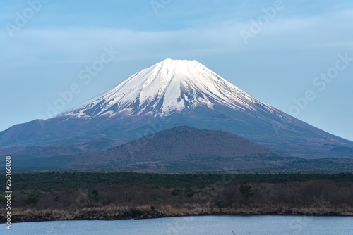 Fototapeta premium Mount Fuji or Mt. Fuji, the World Heritage, view in Lake Shoji ( Shojiko ). Fuji Five Lake region, Minamitsuru District, Yamanashi prefecture, Japan. Landscape for travel destination.