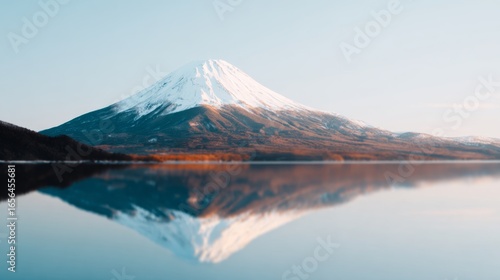 Fototapeta premium Mount Fuji Reflected in Lake Kawaguchi, serene landscape, tranquil water surface, minimalist design, clear skies, peaceful natural setting, harmonious balance, inviting solitude.