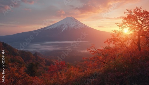 © Anarkali Art, Fototapeta premium Mount Fuji Sunset With Autumn Forest And Sunlight