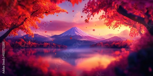 Obraz premium Mount Fuji surrounded by autumn foliage reflected in a serene lake, Autumn...