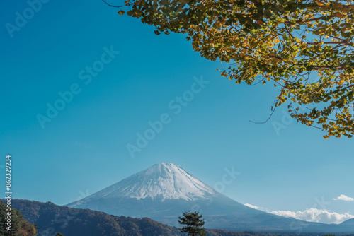 Fototapeta premium Mount Fuji view at Saiko Iyashino Sato Nenba in Autumn season. Mt Fujisan in...