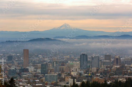Fototapeta premium Mount Hood over Portland Downtown Cityscape in Oregon USA