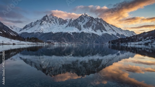 © Shehnaz, Obraz premium Mount Mont Blanc covered in the snow reflecting on the water in the evening in Chamonix,