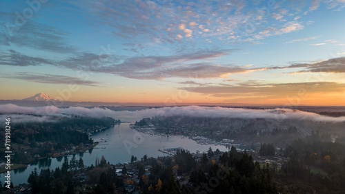 © Drone Northwest, Obraz premium Mount Rainier in Gig Harbor Washington