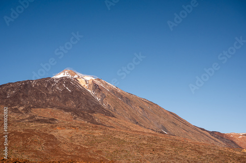 Fototapeta premium Mount Teide volcano with snow on its cone. A cloud skirts its silhouette.