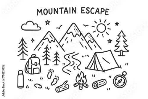 © Viacheslav, Fototapeta premium Mountain Adventure Sketch. Mountain escape. Hand-drawn doodle illustration mountain escape peaks, tent, campfire, stream, pine trees, backpack, compass, sun,