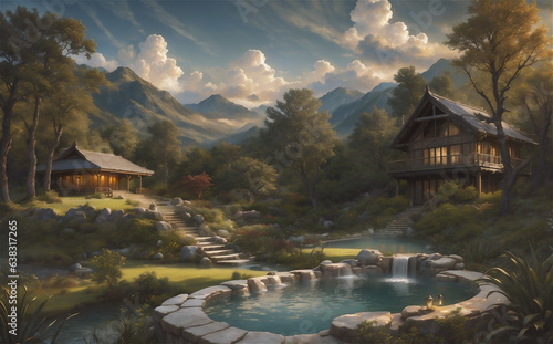 © Frozen Design, Fototapeta premium Mountain and lake Landscape. Cartoon mountains, forest and river scene. Wildlife mystical, Hiking adventure