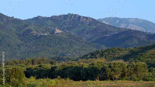 © hassan bensliman, Obraz premium Mountain and Linguizetta vineyards in eastern plain of Corsica