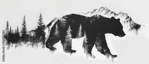 © World of PNG, Naklejka premium Mountain bear with reflected landscape illustration art.