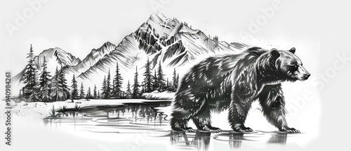 Naklejka premium Mountain bear with reflected landscape illustration art.