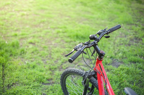 Fototapeta premium Mountain bike of red color with a black rudder on green grass
