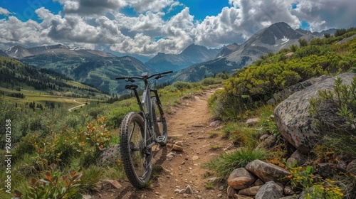 Obraz premium Mountain bike parked on a scenic mountain trail.