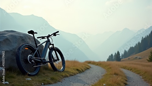 Fototapeta premium Mountain bike resting on a scenic mountain trail, surrounded by grassy fields and distant misty peaks, captures the essence of outdoor adventure and exploration
