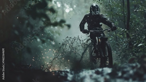 © nurionstudio, Naklejka premium Mountain biker in a rainy forest trail