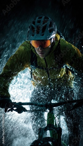 Naklejka premium Mountain Biker in Reflective Jacket Rides Through Rainstorm in Cinematic Lighting