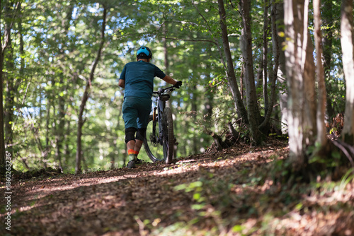 © .shock, Obraz premium Mountain biker pushes through a forest trail on a sunny day wearing helmet and gear