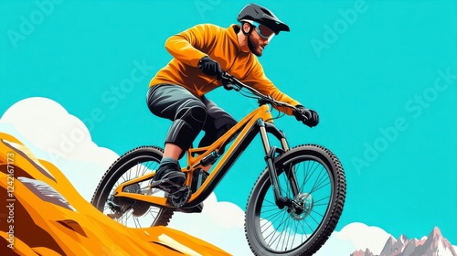 © Yaowarat, Obraz premium Mountain Biker Riding Downhill in Vibrant Outdoor Environment
