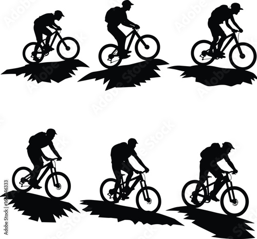 Obraz premium Mountain biker silhouettes riding, extreme sports, downhill cycling, mountain biking action, outdoor adventure, cyclist on trail, biking nature, extreme mountain biking, outdoor sports.