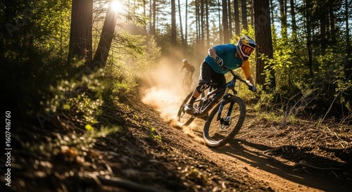 Naklejka premium Mountain biker speeds down dusty trail, sun flares through trees, action shot