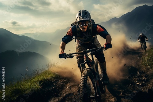 © ballabeyla, Fototapeta premium Mountain biking adventure in rugged terrain. Conquer challenging trails with a mountain bike amidst breathtaking mountain landscapes. 'generative AI'