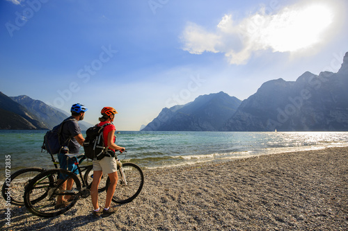 Naklejka premium Mountain biking. Couple with bikes on Lake Garda, Riva del Garda