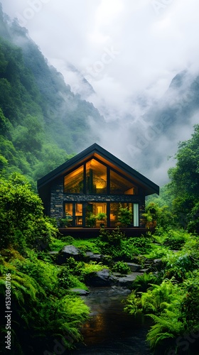 Fototapeta premium Mountain cabin, illuminated, misty valley, stream, serenity