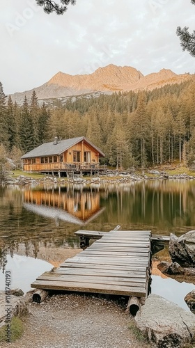 Naklejka premium Mountain Cabin Lake Reflection Serenity Wooden Dock