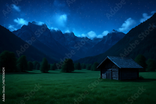 © yh, Obraz premium 星空に包まれた山小屋 / Mountain Cabin under a Starry Sky