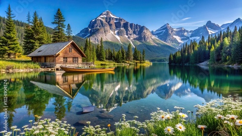 Fototapeta premium Mountain cabin with snow, pine trees, rowboat, clear sky, tranquil water