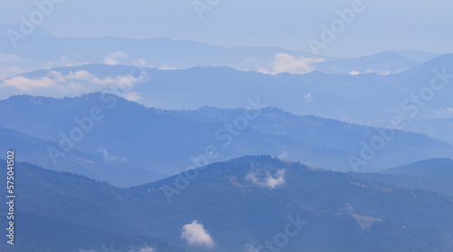 © Yuriy Kulik, Obraz premium mountain chain silhouette in blue mist, natural mountain travel background