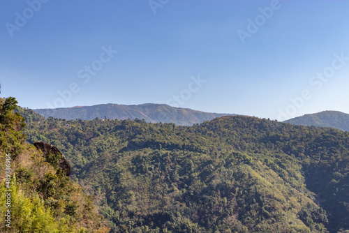 © explorewithinfo, Fototapeta premium mountain covered with green forests and misty blue sky at morning from flat angle