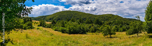 © adamchuk_leo, Fototapeta premium mountain, covered with green trees, under a blue sky with clouds
