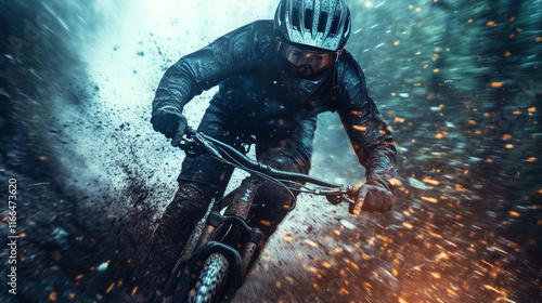 Fototapeta premium Mountain cyclist racing through misty forest with dynamic sparks and fog...
