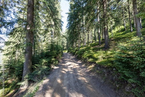 Fototapeta premium Mountain dirt road in the Ukrainian Carpathians on a summer day.